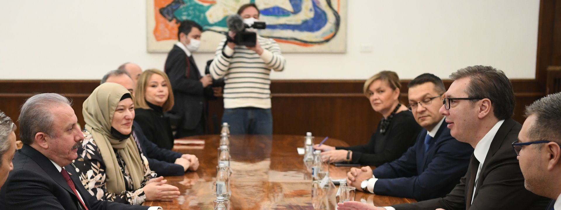 Председник Републике Србије Александар Вучић примио је данас председника Велике Народне скупштине Републике Турске Мустафу Шентопа, који је пренео поздраве председника Реџепа Тајипа Ердогана и констатовао да је управо добар однос двојице шефова држава допринео да односи Србије и Турске буду на историјски највишем нивоу.